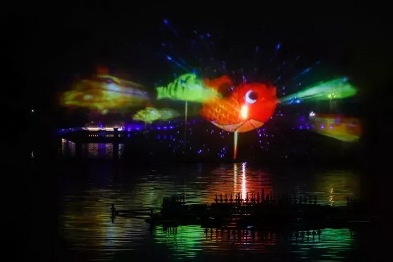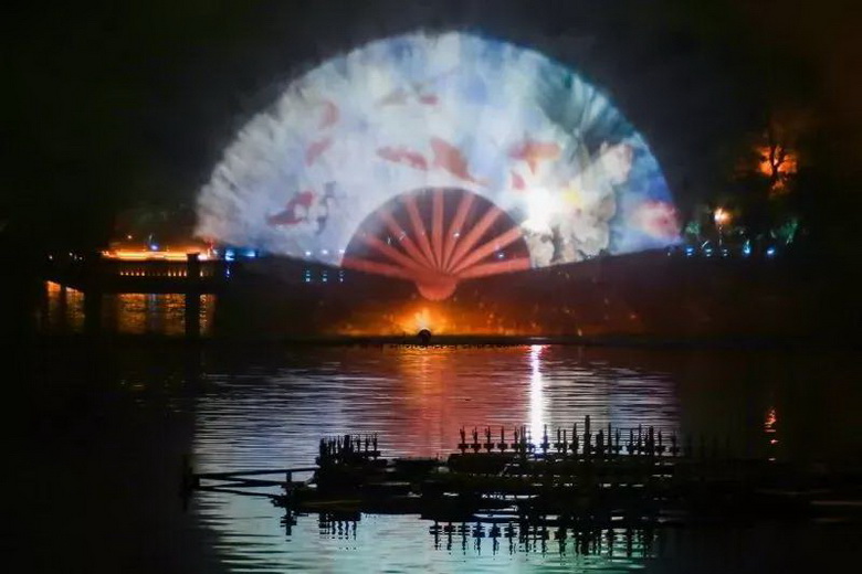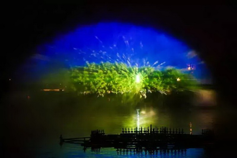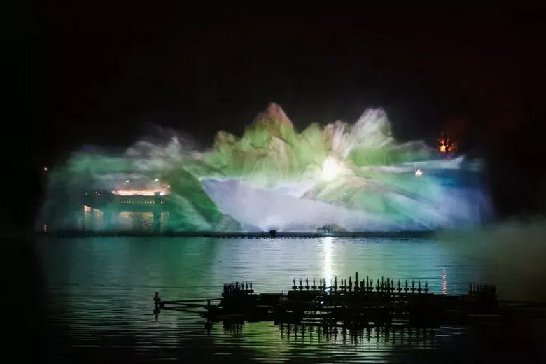玉湖景區3D噴泉投影燈光秀新會首期亮化工程中“兩極一軸”的“城市創新極”的亮點。燈光秀以“古城新篇 攬景勝會”為主題,通過六個篇章,串起新會文化脈絡。