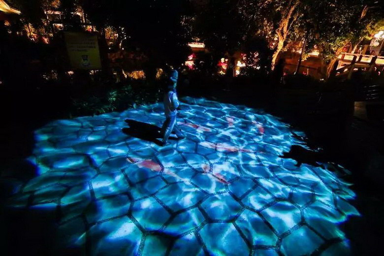 在兩極一軸中,燈光的圖案燈、投影機、水紋燈、光束燈等多種文創燈光燈具,也靈活運用在新會美術館、新會人民會堂周邊、圭峰山永鎮山門、圭峰路、公園路、新豪景廣場,盆趣園,艇仔湖等幾大節點,下面就跟隨小編來一場“眼睛旅行”吧
