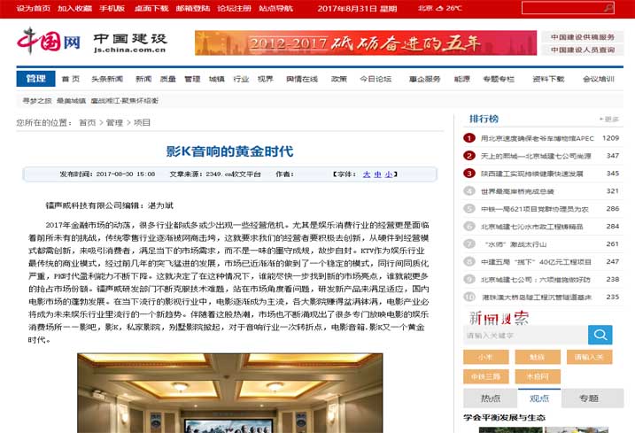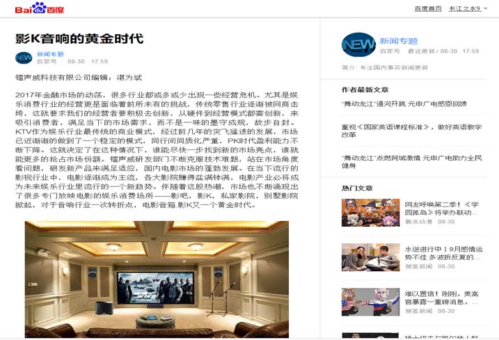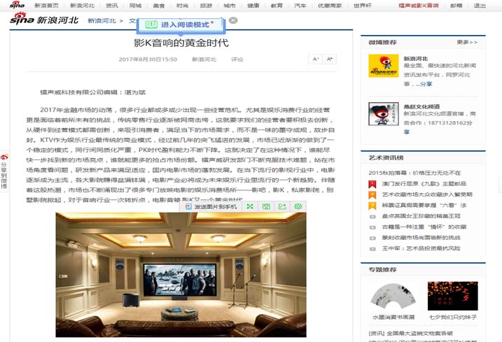 最近一段時間,影K.影吧的話題很熱。各大媒體紛紛報道,由于KTV行業的發展進入高度競爭時期,從前年開始就已經有老板開始投資微影吧,去年也有非常多的人投資做影吧,進入到今年下半年,越來越多的投資人開始關注投人影K.影吧,或是新開、或是轉型、或是融合。看著效果層出不窮的影吧,影吧旳確一直效益不錯,微影吧開業生意很火,鐳聲威推薦衛星音響影吧系統,給投資影吧老板們大大將低設備成本,提高微影利潤空間,工程商安裝也方便。提高工作效率。還有一部分需求是唱歌加看電影也叫影K,影K市場越來越多受到關注,鐳聲威影K,影吧受到媒體高度關注,有百度新聞,新浪新聞,搜狐新聞,中訊網等等.........