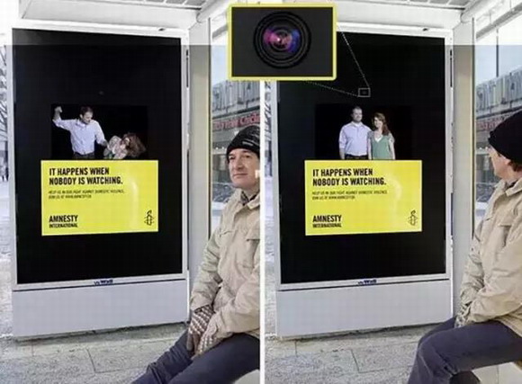 大赦國際組織 (Amnesty International) 在德國漢堡的防家暴廣告:表面起來很和睦的一家人,在你轉過頭去的時候,立馬開始家暴。這不就是生活中很多家暴案例的樣子嗎?