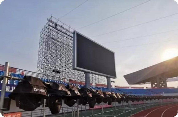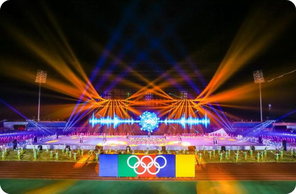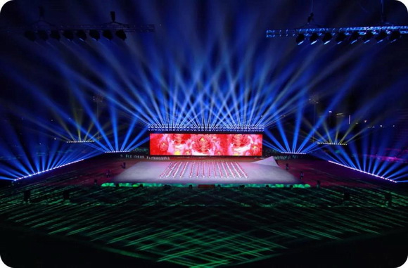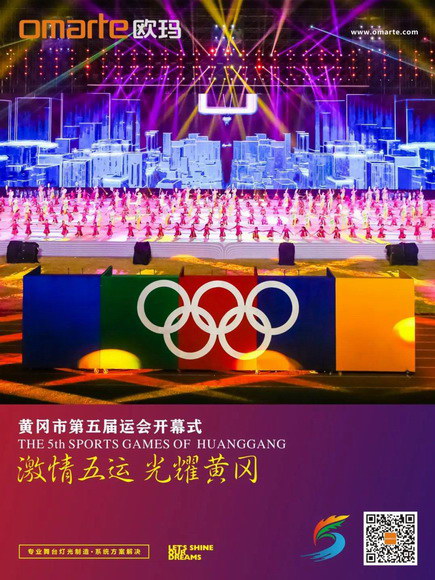 黃岡市第五屆運動會開幕式在蘄春縣奧體中心體育場舉行,開幕式燈光使用了歐瑪LED切割燈(ARES-P7II)64臺;其中面光32臺,逆光32臺,三合一電腦燈(Moore380)100臺;LED蜂眼染色燈(Eos-B19)100臺。
