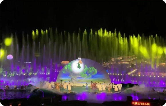《天仙配新傳》突破性地將實景劇、音樂劇、光影劇合而為一,在演唱、舞蹈等實景表演中,廣泛運用了燈光、水效、全息、裸眼3D激光投影、3D威亞、機械特效、洪水體驗等國內頂級舞臺技術。