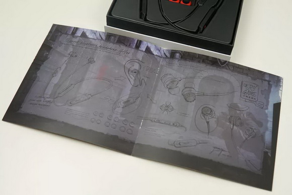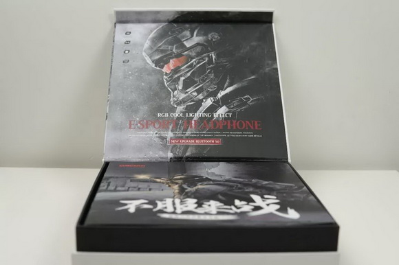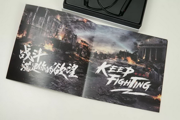 打開盒子第一眼看見的不是耳機本體而是一本游戲小冊子,里面有游戲插畫還有這款耳機的設計手稿,還是很用心的,這“不服來戰(zhàn)”四個字讓人看得立刻有“戰(zhàn)斗”激情了,想立刻打開和平精英打上兩局,但是,還是先看東西吧。