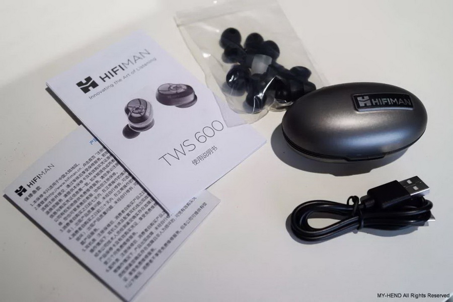 將上層實(shí)體取出后,底層則為耳機(jī)的使用說明書、保修卡、多對耳塞套與一條充電線,耳塞套的大小不一,可以供不同耳型做替換。