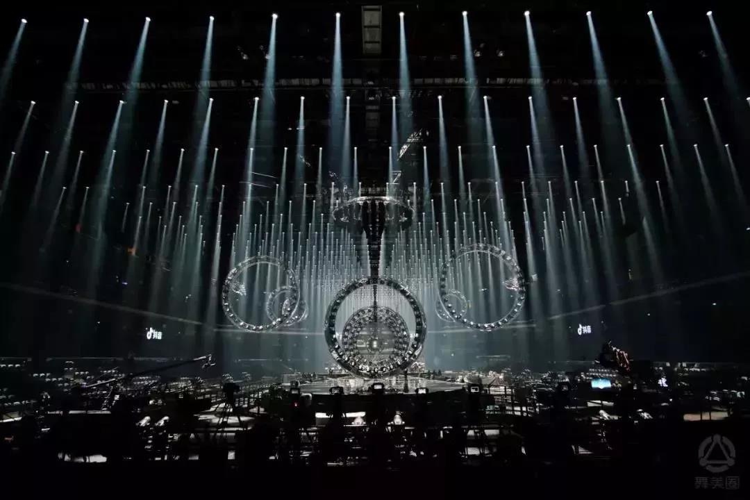 江蘇衛視跨年舞臺,打造了一個科技感十足的水滴形舞臺,采用360度全景“四面臺”舞美,極具新意。巨型水滴形裝置共12個圓形結構,每個結構都安裝有舞臺光束燈及效果燈帶,所有結構由數控機械控制,可以變化出各種造型,整體視覺好似一艘即將啟航來自太空的飛船。