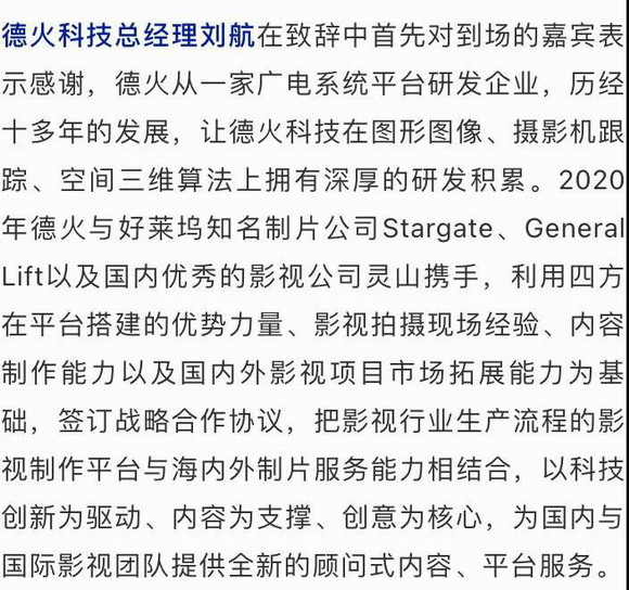 會上德火科技通過虛擬與現實技術,與靈山科技及跨時空而來的美國知名制作公司Stargate、General Lift,進行了一場橫跨時間與空間的戰略簽約,作為新技術的試驗場,這次簽約儀式對現場見證者來說具有劃時代的意義,這無疑也是影視拍攝技術上新的發展與變革。