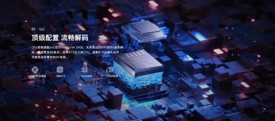 創維Q91系列電視就搭載了全球目前最為強勁的一款8K電視SoC芯片MediaTek S900,支持高達60FPS的8K硬件解碼,兼容更多8K格式,讓8K畫質天生流暢
