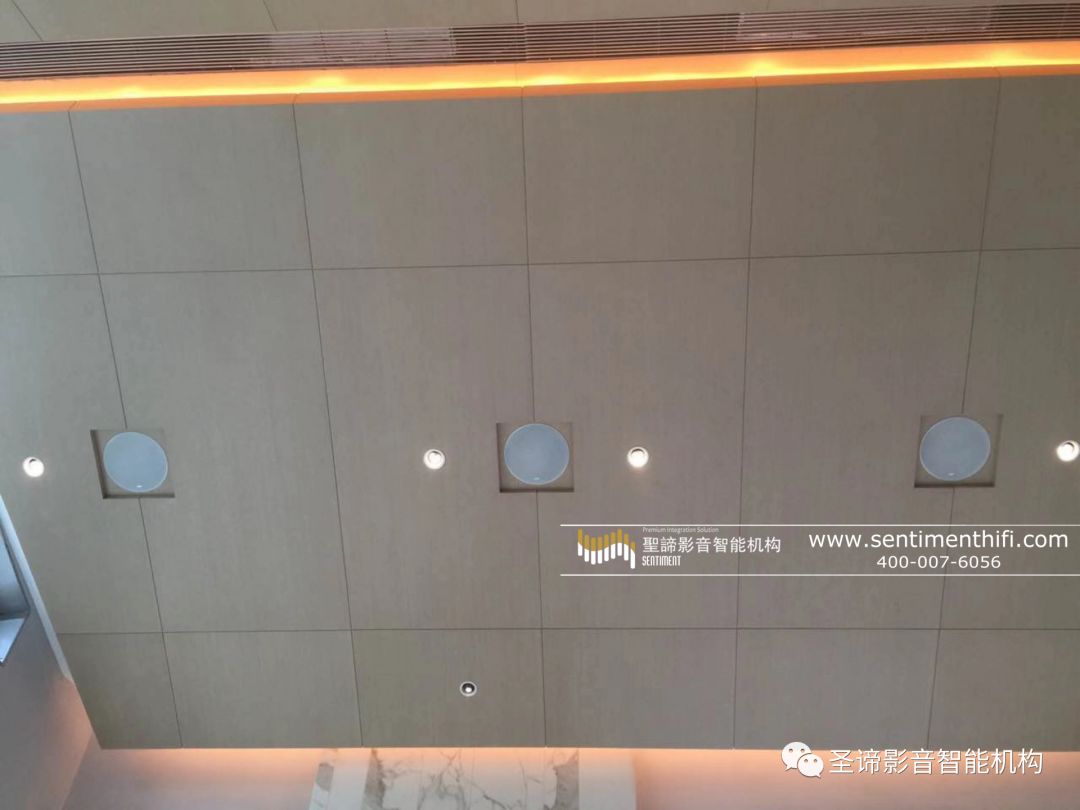 應(yīng)對高層高兼顧聲學(xué)和美觀性的難點,圣諦設(shè)計了屋檐斜降式的天花板,并且選用了6只吸頂音箱嵌入其中,保留空間感的同時讓聲音從上至下有所延伸。
