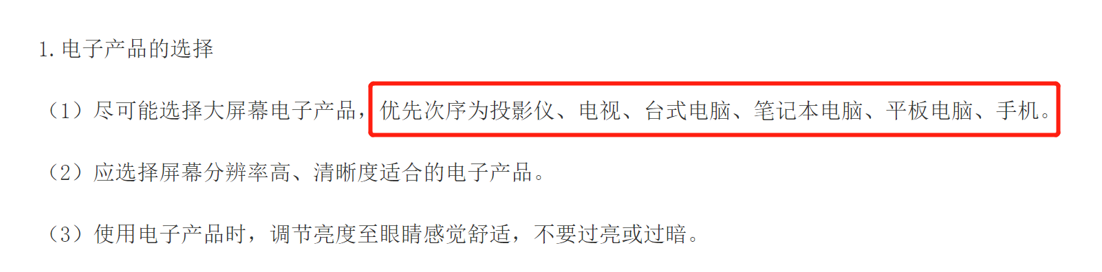 日前,國家衛生健康委發布了《兒童青少年新冠肺炎疫情期間近視預防指引》,對電子產品的選擇優先次序做出了規范,《指引》指出:“盡可能選擇大屏幕電子產品,優先次序為投影儀、電視、臺式電腦、筆記本電腦、平板電腦、手機。”