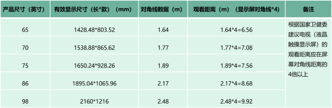 根據衛健委《指引》指示,使用電視時,觀看距離應在屏幕對角線距離的4倍以上。由數據計算,65英寸電視的要求觀看距離應為6.56米;70英寸電視要求觀看距離應為7.08米;75英寸電視的要求觀看距離應為7.56米;86英寸電視的要求觀看距離應為8.68米;98英寸電視的要求觀看距離應為9.92米。