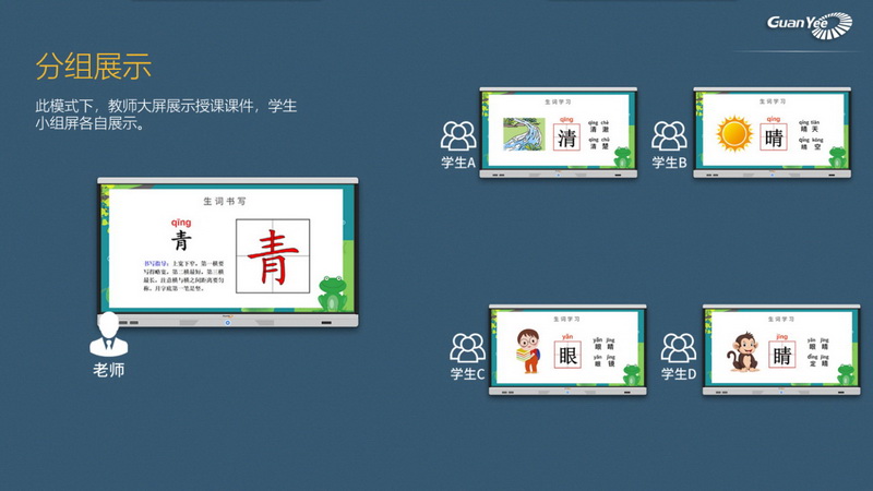 展示模式:老師主屏自帶控制功能,可輕松調(diào)取小組屏幕至主屏,其他小組屏默認(rèn)自動(dòng)同步顯示
