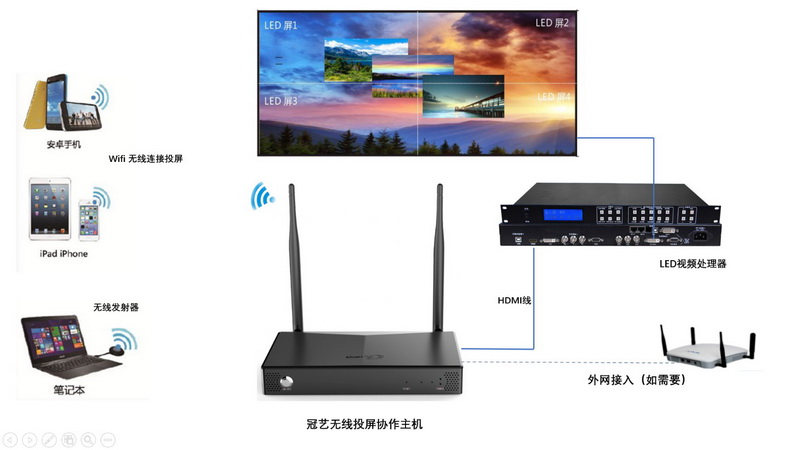 方案簡介: LED大屏特別小間距LED顯示屏近幾年蓬勃發展,市場規模快速增長,小間距LED屏憑借著其輕薄易安裝、適用范圍廣、生產速度快、使用壽命長等優點,快速搶占數字光處理投影技術(DLP)和大屏液晶的市場份額。 應用領域廣泛,主要應用領域有公共顯示、安防監控、商務教育等。 目前中國LED大屏市場已過紅利期,市場已經朝向產品精細化,性價比方向發展,常規LED大屏產品同質化嚴重,生產企業、渠道商利潤擠壓嚴重、市場競爭激烈;如何增加LED大屏系統方案差異化,增加方案獨特性將是近今年該行業考慮的問題。冠藝無線投屏協作系統的推出將完美助力LED大屏系統,豐富其投屏方案。 冠藝G801系列無線投屏協作系統可將Windows/Mac電腦、安卓/蘋果手機平板等設備屏幕輕松無線投屏至大屏幕顯示; 多終端同步連接最多可實現9畫面分割同時顯示。用戶只需將USB口發射器插入電腦,按鈕一鍵投屏,簡單方便 手機平板連接主機WiFi即可投屏,所有終端支持影音同步輸出,高清1080P,超低延遲,多終端畫面無縫切換 配合新品三合一接口發射器,可以將TYPE-C口電腦/手機、HDMI口電腦/機頂盒/攝影機等真正免驅一鍵投屏 做工品質一流、支持7*24小時運行、實用新型設計、豐富的功能拓展滿足常規會議室,展廳,報告廳,教室,培訓,酒店等眾多場景應用 系統連接圖