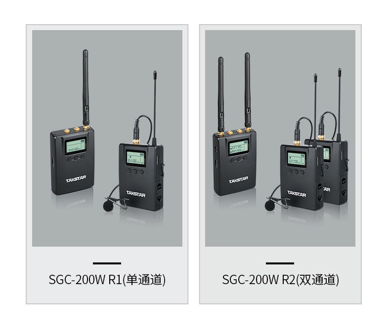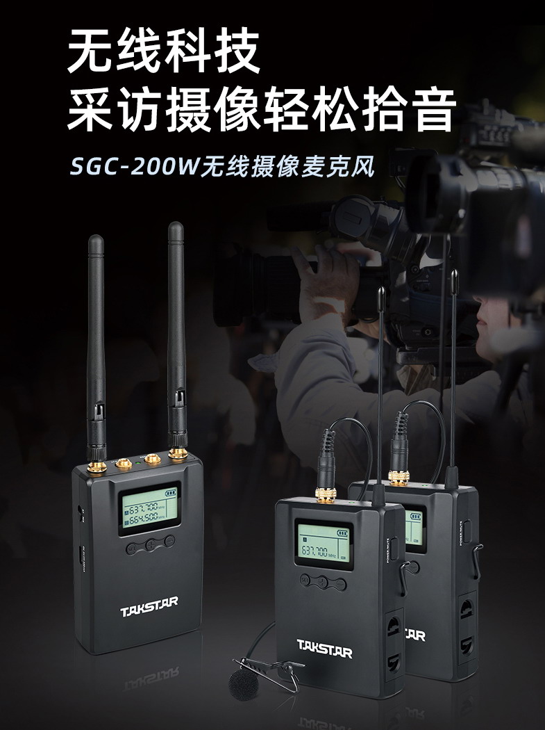 SGC-200W針對新聞采訪、視頻拍攝而設計,由接收器、發射器、領夾麥克風組成,配有麥克風夾子、防風棉、3.5mm音頻轉換線、手機轉換線等,組成一套完整的無線攝像麥克風拾音系統。