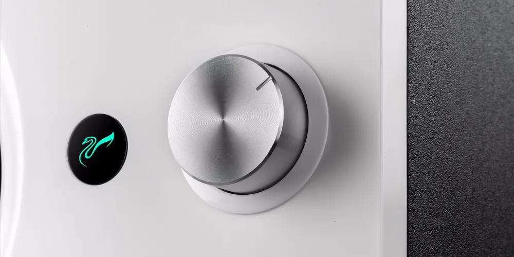 超低音前面板配備總音量調節旋鈕,通過點按該旋鈕還可以進行輸入信號通道的切換,近場聽音時可輕松操控。