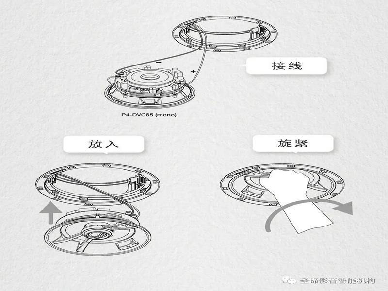 P4-C65吸頂式定制安裝音響進(jìn)化的安裝方式成功實(shí)現(xiàn)了快速安裝。憑借一個(gè)能夠進(jìn)行預(yù)先安裝的框架底座,揚(yáng)聲器的安裝只需接線-放入-旋緊三部曲。