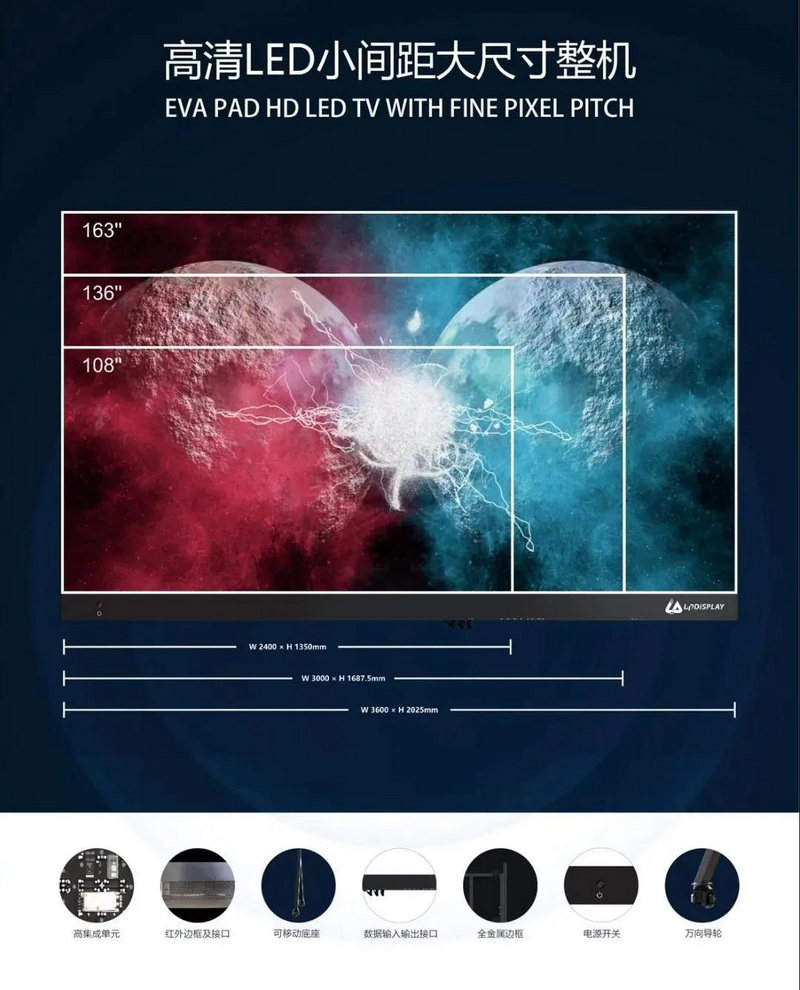 藍(lán)普視訊隆重推出 EVA PAD 高清LED小間距大尺寸一體機(jī),作為小間距大尺寸一體機(jī),由BSU63J的P1.2間距作為一體機(jī)的主體搭建,有著108英寸、136英寸、163英寸多種大尺寸可自由拼接,同時(shí)具備箱體本身28mm的超薄厚度,高對(duì)比度、3840Hz高刷新率、寬色域范圍帶給你更好的視覺(jué)體驗(yàn),同時(shí)多種功能、多種數(shù)據(jù)傳輸方式更適用于多種場(chǎng)景。