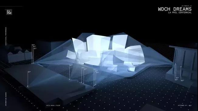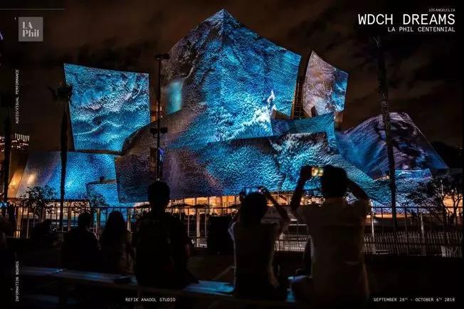 沃爾特·迪斯尼音樂廳,坐落洛杉磯,擁有起伏的不銹鋼外觀。這一年Refik Anadol和他的團隊接到一項任務將這座音樂廳打造為“夢想”主題的大型藝術裝置。Anadol擅長數據整合創作,于是他提出:“用一種創造性的、計算機化的“大腦” 來模仿人類如何做夢,通過處理記憶來形成圖像和想法的新組合。”
