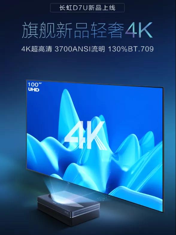 激光電視基于投影顯示技術發展而來,投影畫面可以很輕松突破尺寸限制;采用超短焦技術縮短了傳統投影顯示需要的投射距離,主機近墻擺放就能在抗光屏幕上投影出大尺寸畫面。以長虹激光電視D7U為例,主機后端離墻約19cm就能投射100寸的畫面,客廳無論是大還是小都能擁有。
