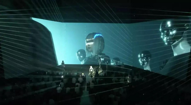 由屏幕組成的服裝,四聯同步:音樂、視頻、舞蹈、服裝形成一個整體效果,一場精彩未來感十足的視聽盛宴。