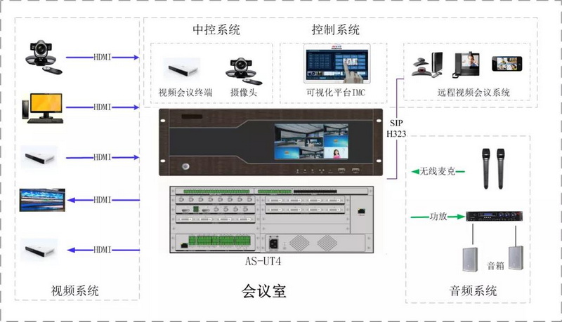 本方案使用一臺視通科技多媒體綜合管理一體機,集音頻系統,視頻系統,遠程會議系統,中控系統應用為一體,通過可視化綜合管理平臺實現會議室互聯互通,集中管控。