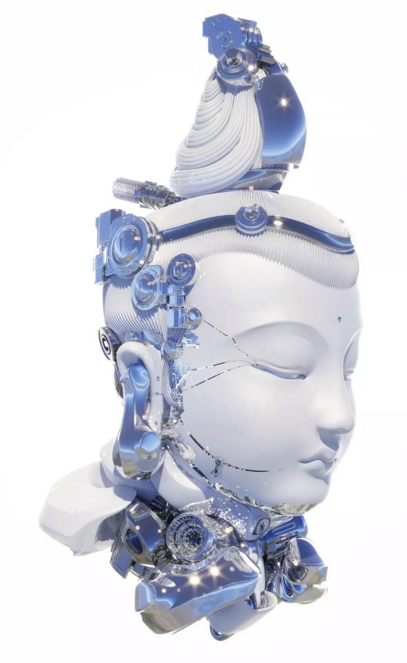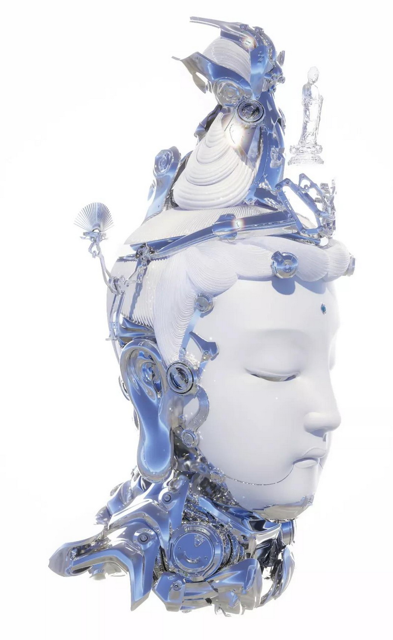 談起大悲宇宙是什么時候被社交網絡所熱議的,就不得不談起其未來感十足的半人、半機械、半神的作品《未來仏》。2020 年十一期間大悲宇宙在上海完成了《一百個未來并聯「仿佛」并聯一百個未來》大型多媒體裝置展。