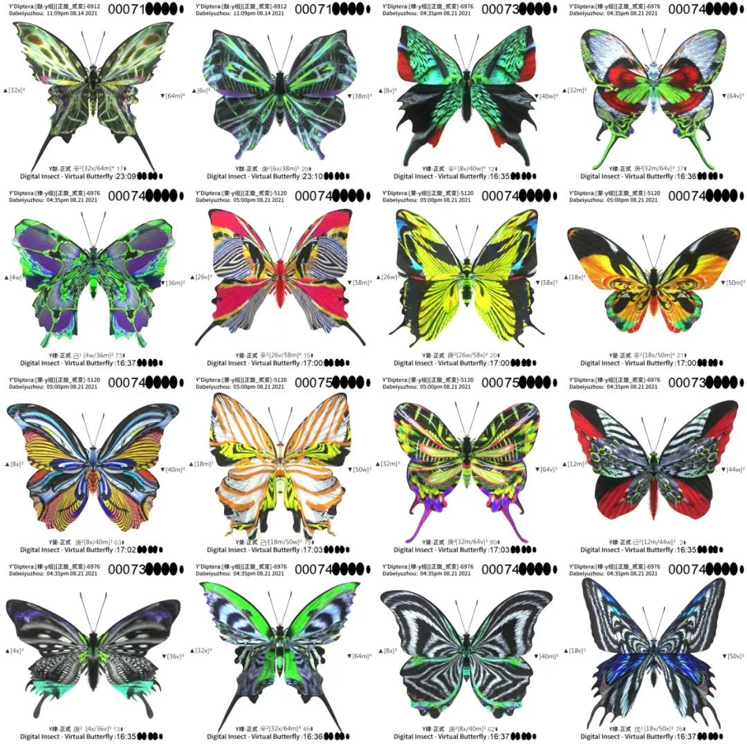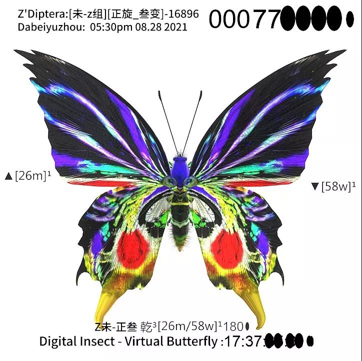 在進行《虛擬蝴蝶》的創作中,算法給大悲宇宙提供了更多可能性的拓展,他也借由算法提升自己的學習進度,在不到一個月的時間里,他就通過算法和他的篩選得出了兩萬只獨一無二的虛擬蝴蝶,這樣的速度不經讓大悲宇宙感嘆,在這樣的時代背景下借助計算機的力量釋放了自己的勞動力和創造力,同時他也感受到了科技放大了藝術的感知力和創造力。