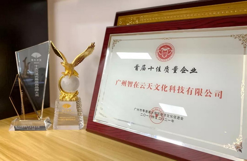 在兩大盛會上,智在云天分別榮獲了「中國灣區首屆十佳質量企業」、「金孔雀獎·2021十大沉浸式集成商品牌大獎」、「金孔雀獎·2021十大光影藝術集成商品牌大獎」等多個獎項。