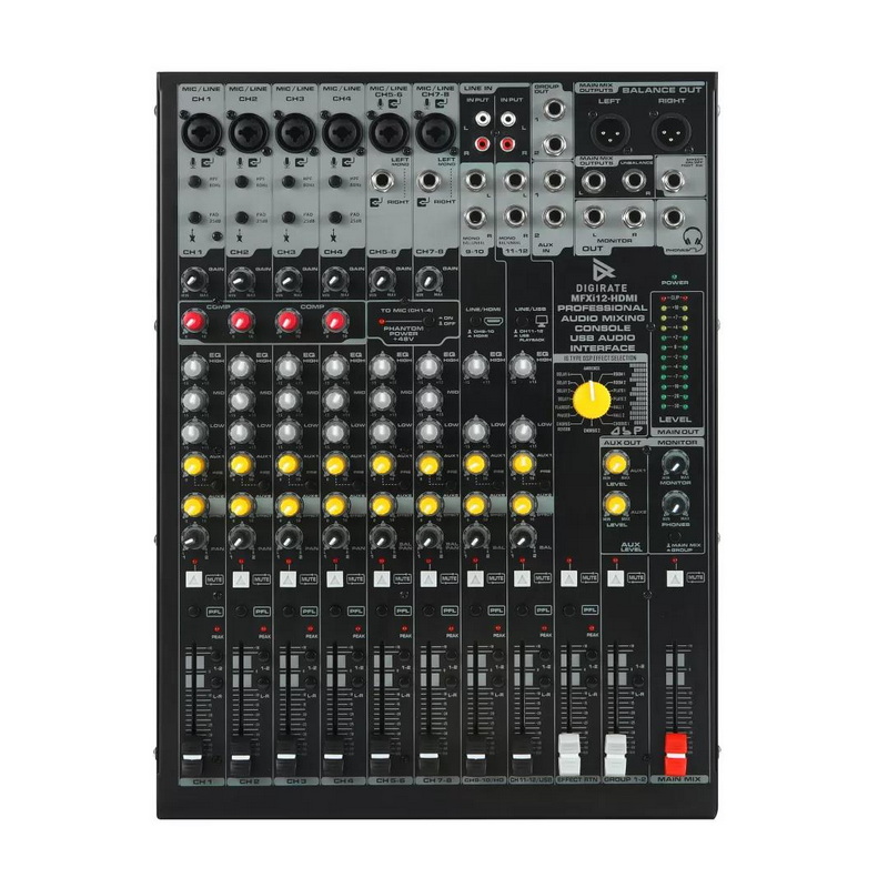 ●多種通道選擇切換開關(guān):PFL(推子前監(jiān)聽)通道開/關(guān),GROUP (編組1 - 2)通道開/關(guān),L/R立體聲開/關(guān),PRE 開/關(guān),LINE/HDMI 音源切換開關(guān),LINE/USB 音源切換開關(guān),PRE 開/關(guān)。