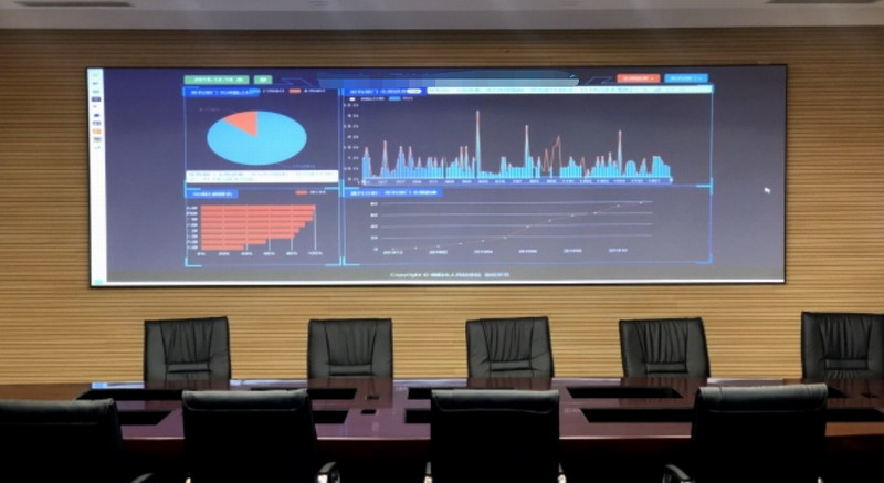 在某檢察院調度室,長虹工程激光電視通過智能融合呈現超寬幅畫面,約220吋的屏幕是整塊的菲涅爾光學屏幕,完全沒有拼縫,圖像尤其是可視化數據圖表的展示不會被切割。