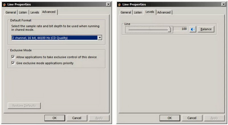 切換到“高級”選項卡,然后選擇“ 2通道,16位,44100 Hz(CD質量)”,如下所示(左)。現(xiàn)在單擊“應用”。接下來,選擇“級別”選項卡,并確保將級別設置為最大,如下所示(右),并且不要設置靜音。DATS在1通道輸入或44.1 kHz以外的采樣頻率下將無法正常運行。