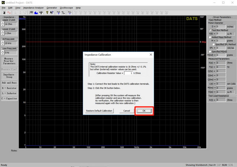 從DATS “Impedance Analyzer”菜單中選擇“Test Leads Calibration…”。將測試引線短路,然后單擊 “OK”,以針對測試引線電阻校準軟件。測試引線電阻應小于1歐姆,如下圖所示的DATS屏幕右下角所示。如果測試引線無法校準,在 “Impedance Analyzer”菜單下選擇 “Impedance Calibration…”,單擊 “Restore Default Calibration”,并重復測試引線的校準過程。
