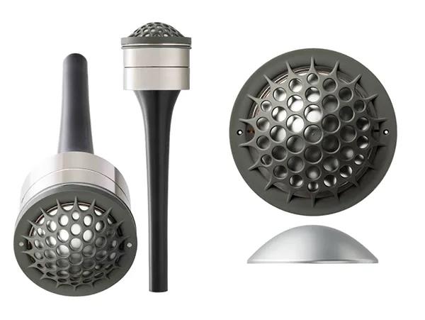 單元后方也有學問。他們的磁鐵稱為Super Flux Magnet,Vivid高音單元的磁鐵必須配合導管形狀,不能太大,這樣也才能更拉近和中音單元的距離。因此他們的磁鐵磁力特強,高達2.5特斯拉。高磁力的磁鐵,有助于提高Vivid音箱的單元效率,例如G1上所使用的高音單元,效率就高達97dB,更利于再生細節。音圈繞線采包銅鋁線,取其質量輕的特點。而音圈與磁鐵間的距離,也就是所謂的磁隙越小越好,這樣才有更高的磁通量帶動音圈?墒,當音圈運動時,會擠壓到磁隙內那極少的空氣,這會阻礙音圈的運動。Vivid的解法是在音圈套筒上挖出孔洞,這稱為Highly Vented Former (HVF) 。
