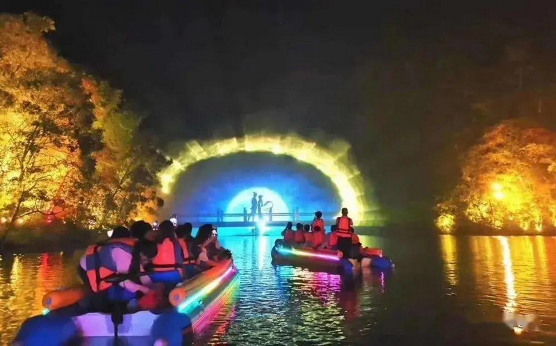 采用最新5D、全息投影、互動新媒體、裝置藝術、燈光秀等技術與九龍潭特有的水上丹霞地貌、巖石、洞穴相結合,建設成為全國首個水上丹霞行浸式山水夜游項目。