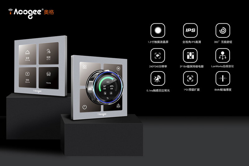 X系列旋鈕內嵌1.3寸觸摸液晶屏,高清全視角240*240分辨率,分布式每單聯各集成3路16A磁保持負載,強大穩定LonWorks總線保證,0.1ms毫秒級觸感背光感應,極致8mm貼墻厚度,優雅之上,極富魅力。