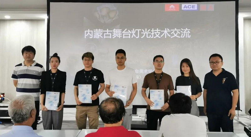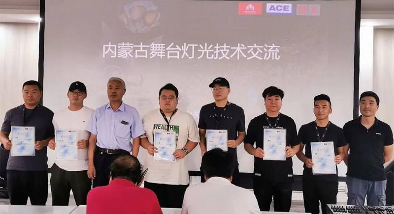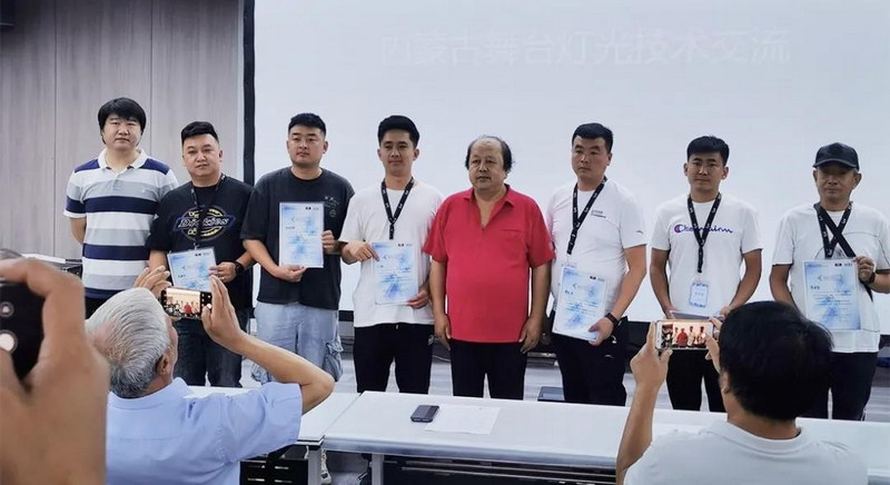 培訓結束后,由內蒙古舞臺美術學會會長浩特,內蒙古舞臺美術學會名譽會長解力軍、白呼和,副會長阿哲、李太平、劉鵬,與安恒利燈光部內蒙古區域銷售經理蘭詩溢,產品推廣副經理李怡燃,技術支持經理李晨陽,技術支持副經理張志朋,系統技術工程師于志強分別為所有學員頒發培訓證書。