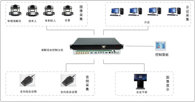 數字審理綜合控制主機、調解綜合控制主機、應用電腦、圖像采集、證據采集、顯示輸出、旁聽及信息展示、音頻采集、音響擴音、可視化集中控制終端、同聲傳譯、存儲擴容。