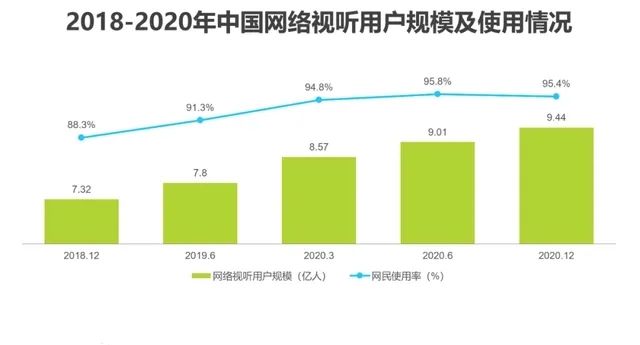 截至2020年底,中國網絡視聽用戶占整體網民規模的比例已高達95.4%。