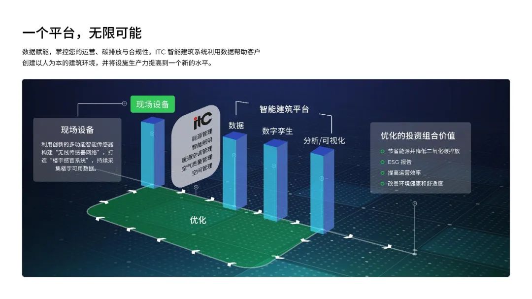 報告提到90%的碳排放來自建筑運營,其中耗電量占全球耗電量55%;當前樓宇管理系統在系統配置、監測準確率、設備或系統集成穩定性、智能化控制、運維水平等方面都存在不同程度的問題。為改變這一現狀,itc開發出一系列的創新技術來構建可靠的智能建筑基礎設施,通過現場設備、應用模塊及具有強大分析和可視化的智能建筑平臺,為建筑運營核心領域帶來全新效率,對樓宇進行持續優化,實現最佳的運營性能。