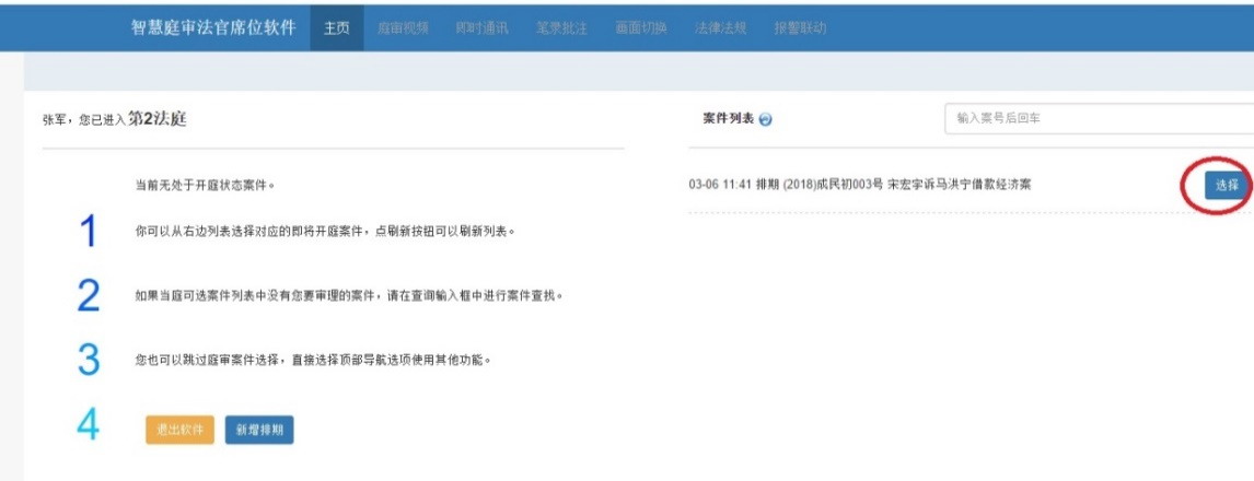 系統支持案件導入、開庭、休庭、閉庭等庭審進程控制,支持對多個案件同時開庭(并案處理)