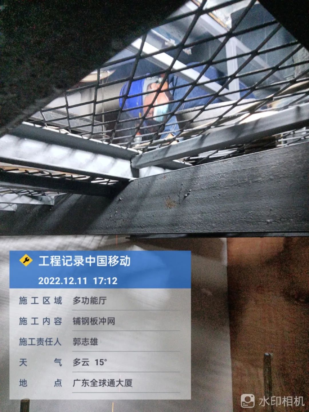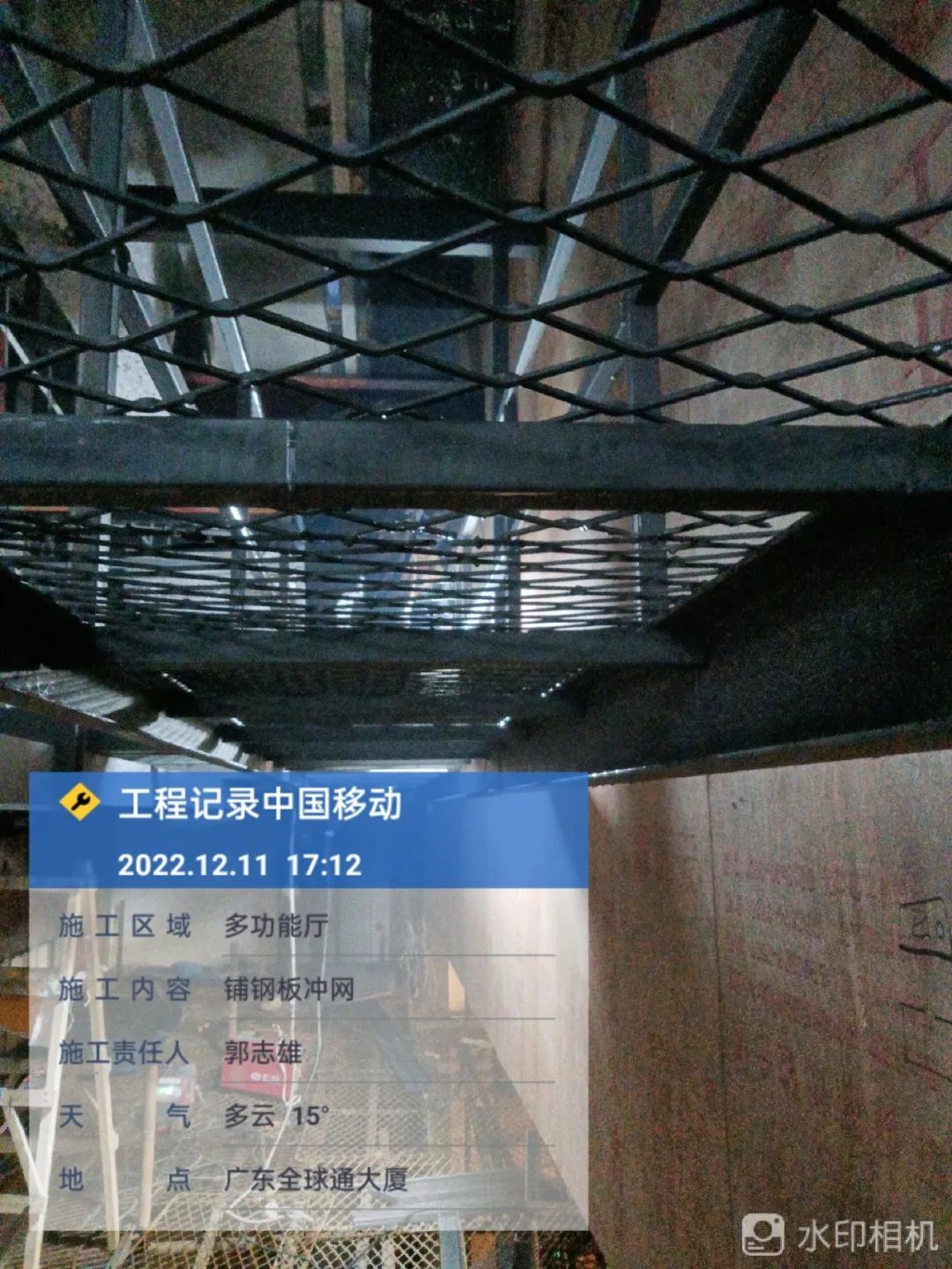 馬道主梁及輔梁安裝完成,進鋼板沖網的安裝與固定