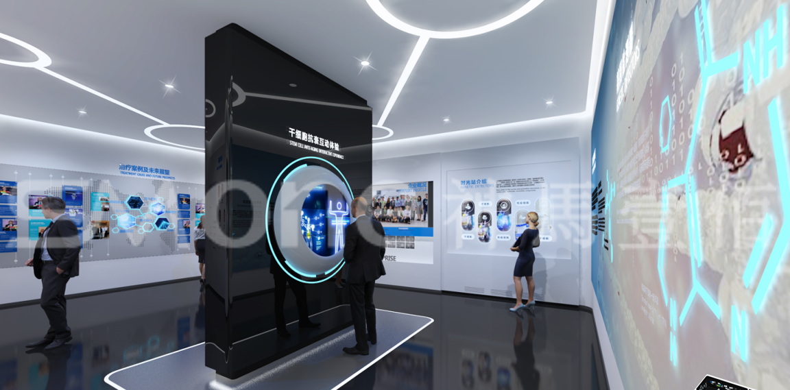 干細胞機械互動裝置實時感應監測透明屏人體無名氏外表發生變化,相連的打干細胞裝置從透明屏人體腳底將填充干細胞,由感應裝置接收信息,根據打氣的多少展示干細胞的多少和面容的改變。