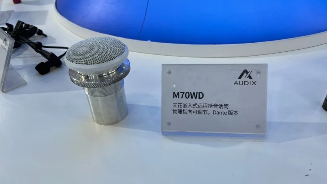 AUDIX區域主要展示了經典、常規產品,種類繁多,有偏樂器應用類產品,有偏錄音棚應用類產品,有偏工程師應用類的測試話筒,有偏歌手應用的手持動圈話筒,也有專供口琴、beatbox這類特殊應用的話筒等等,其中AUDIX的新產品M70WD為dante的吸頂話筒,通過話筒的環來調節安裝的不同天花的厚度,可通過網線直接連接到dante盒,實現全數字化傳輸,并且可通過網絡進行實時控制。