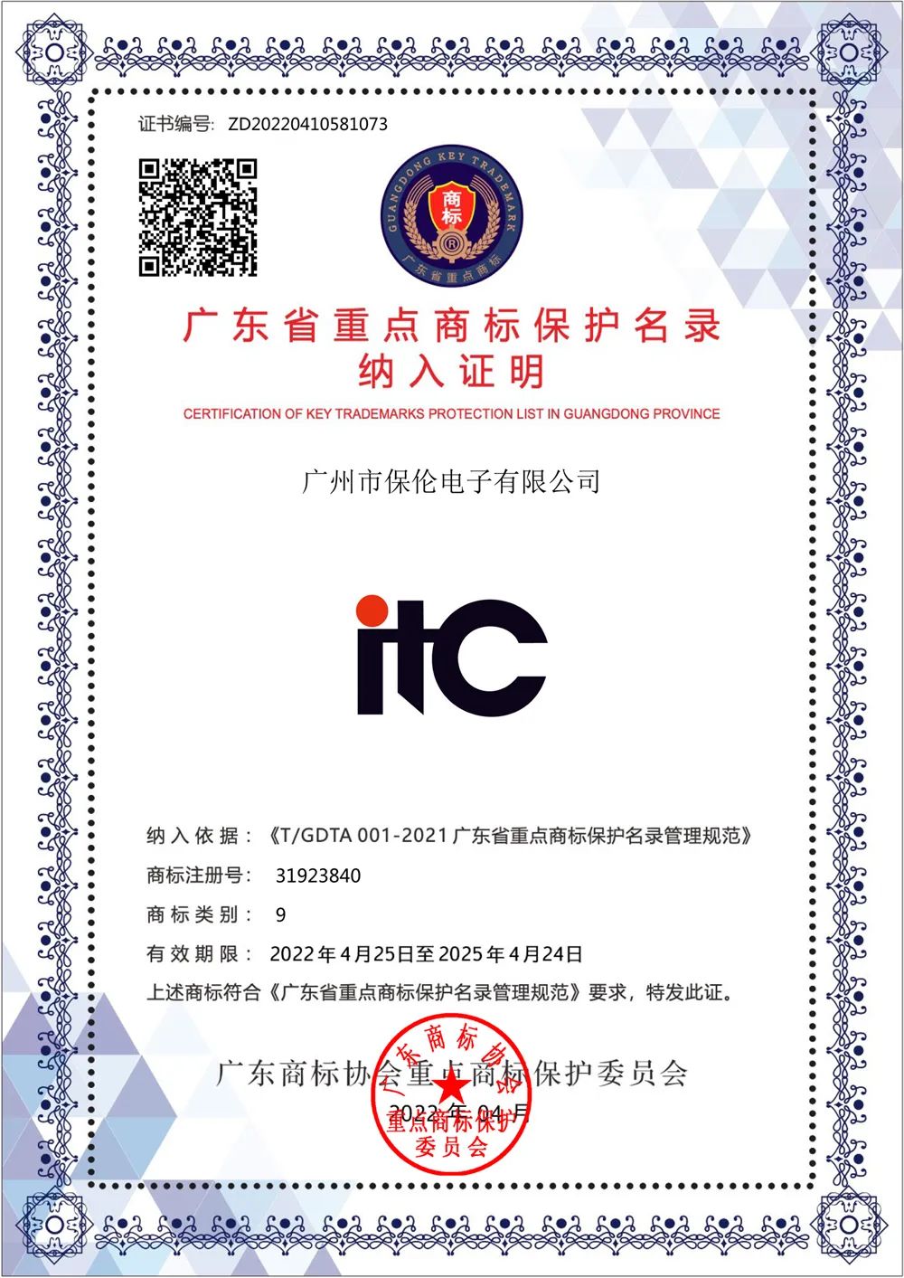 2022年4月25日,2021年度廣東省重點商標保護名錄正式公告。本次活動共有1287件申報材料進入專家評審環節,經過商保委審議會議后,有580件商標進入公示環節,公示過后,最終共有607件商標被納入2021年度廣東省重點商標保護名錄。廣州市保倫電子有限公司“itc”、“ITC”商標從眾多申請中脫穎而出,成功納入2021年度廣東省重點商標保護名錄。