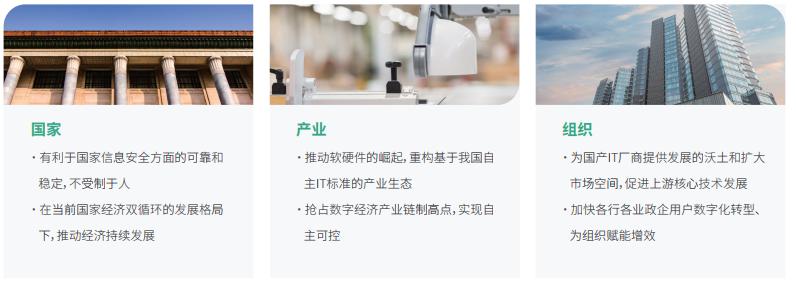 為了解決本質安全的問題,“信創”(即信息技術應用創新產業)這一國家戰略應運而生,旨在逐步建立基于自己的 IT 底層架構和標準,形成自有開放生態,通俗來講,就是在核心芯片、基礎硬件、操作系統、中間件、數據服務器等領域實現國產替代、實現自主可控。