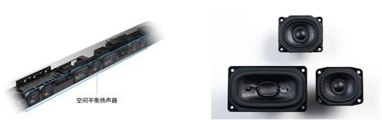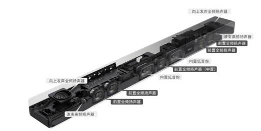 HT-A7000使用索尼的空間平衡揚聲器單元,因為回音壁體積受限,能使用的單元振膜面積越小,越難產生高聲壓。在空間平衡揚聲器單元中,振膜的形狀接近圓角矩形,有效面積更大,邊緣壓印的圖案在保持振幅平衡的同時,還能進一步減少輕微失真,增強聲音的真實感。向上發聲揚聲器單元帶有一定的傾角,可以讓有高度的聲音通過天花板的反射傳達到聆聽者的耳中,從而提升聲音的高度感。