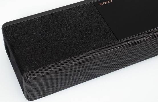 HT-A7000用到的材料包括金屬網罩、玻璃材質上蓋板以及兩側天空聲道單元上的獨特織物材料。兩側頂部覆蓋選擇織物材料的原因,是為了避免天空聲道聲音向觀眾直接傳播,而正面的金屬網罩則能嵌入小型屏幕,使得操作更便捷直觀,頂部的玻璃材質強化機身硬度,有效抑制共振。不過玻璃上蓋板在離電視比較近的情況下可能會反光,可以考慮鋪一塊布。