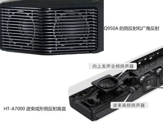 Q950A側反射環繞+廣角環繞的喇叭,對應A7000的波束高頻喇叭,Q950A的紙面數據略勝一籌,相反A7000的喇叭選擇了另一條獨特的道路,在既有的空間內做合理的安排,在單元本身加入更多的黑科技,同時通過算法提升喇叭之間的協作工作。