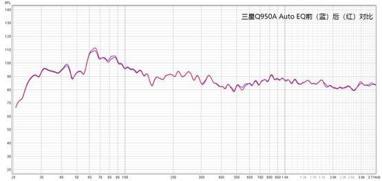 三星的auto eq功能從發出的測試音來看,更像是在校正低頻,然而多次實際測試校準前后的頻響,都沒發現什么明顯的變化。(紅色線為校準后)
