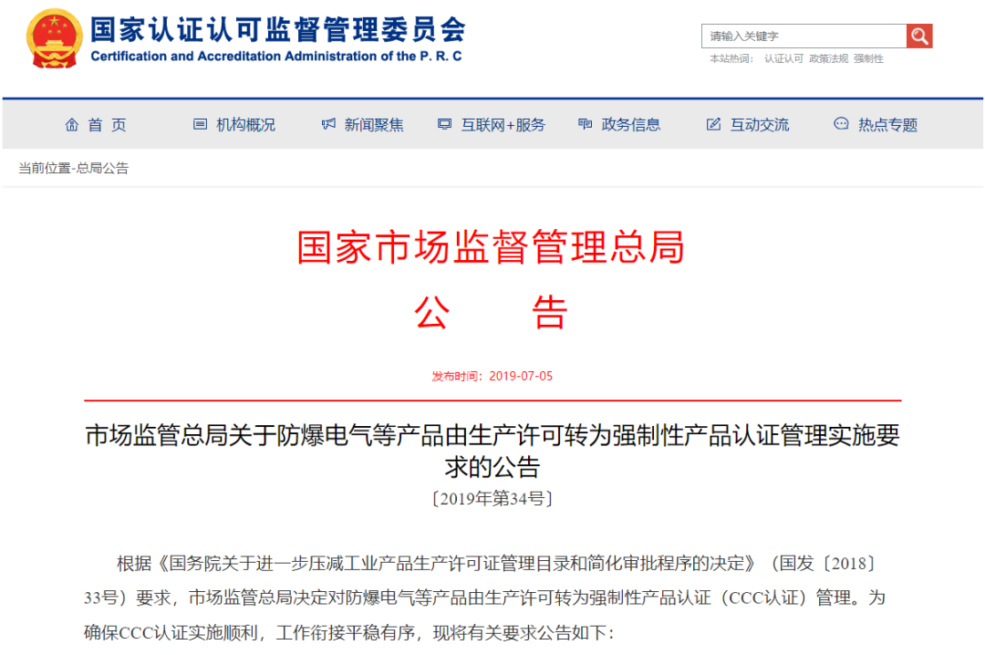 隨著工業(yè)化進(jìn)程不斷發(fā)展,產(chǎn)品生產(chǎn)、防爆安全越來(lái)越被行業(yè)所重視。按市場(chǎng)監(jiān)管總局2019年34號(hào)文要求,自2019年10月1日起,防爆電氣產(chǎn)品納入CCC認(rèn)證管理范圍。