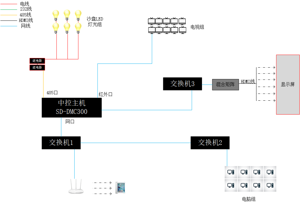 此次項目中采用了DMC300全網絡可編程中央控制主機。控制26臺電腦主機開關、20電視開關、3臺電腦主機視頻播放、4臺投影機開關、8乘8矩陣信號切換。